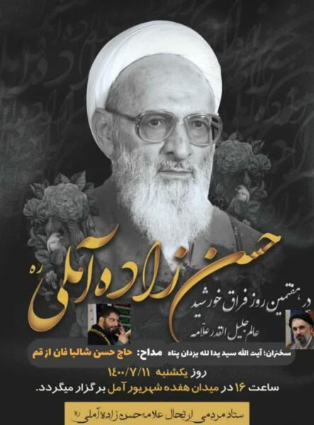مراسم هفتمین روز رحلت علامه ذوالفنون آیتالله حسنزاده آملی رضواناللهتعالیعلیه با سخنرانی حضرت آیتالله استاد یزدانپناه با حضور آحاد مردم شریف ایران در شهرستان آمل برگزار میشود. زمان: یکشنبه ۱۱ مهرماه، ساعت ۱۶ مکان: میدان هفده شهریور شهرستان آمل
